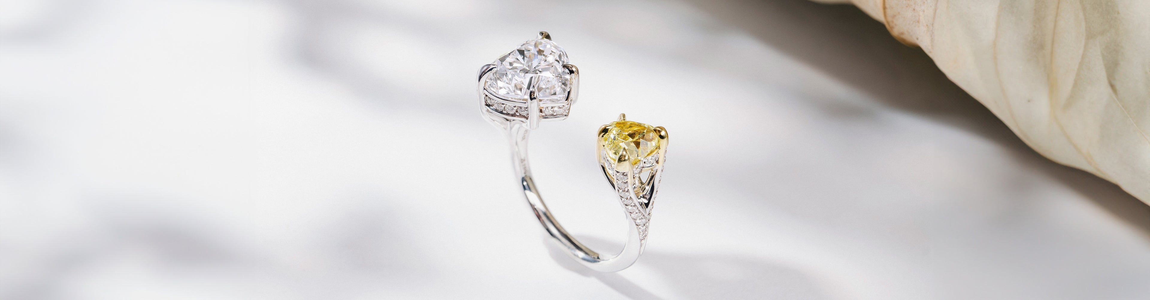 Anel de dois dedos de esmeralda com diamantes brancos em ouro 18k branco e amarelo