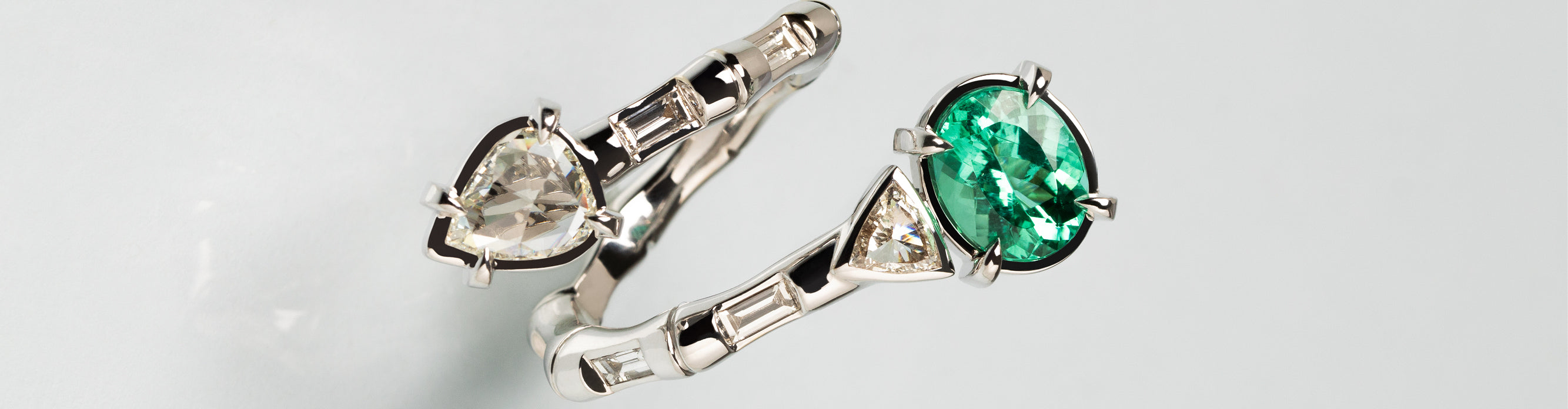 A estrutura do bambu, planta que combina leveza e resistência e cresce rapidamente, é o ponto de partida da coleção – uma celebração em ouro à força da natureza. “Plantamos bambu em nossa casa de campo, no interior de São Paulo. Fiz a primeira peça e ficou linda. Aí fiz outra e, quando percebi, já tinha nascido uma coleção inteira”, conta Ara. Os anéis têm diamantes cravados em toda a sua estrutura e uma gema colorida poderosa, como diamantes Fancy Intense Orangy Pink ou Fancy Vivid Blue.