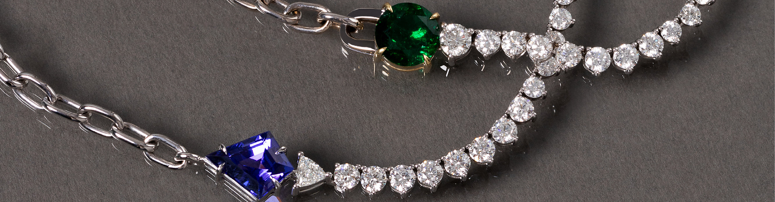 Dessa fusão, nasce um híbrido muito contemporâneo: colares que começam com elos do metal e desaguam em uma sequência de pedras, como ametistas, rubelitas, esmeraldas, turmalinas Paraíba e diamantes. Uma combinação surpreendente, que sintetiza com perfeição o design da marca.